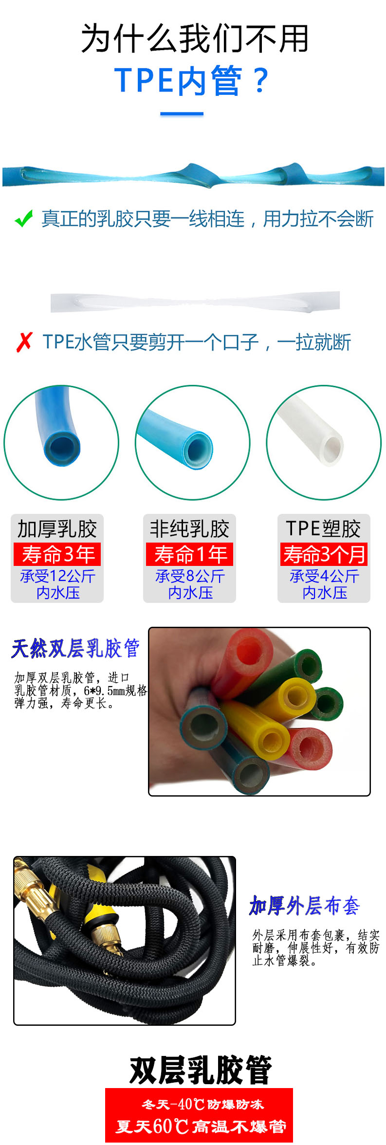 【產(chǎn)品材質(zhì)】:包膠澆花水槍采用ABS和橡膠制成,銅制金屬接頭,堅固耐用,不生銹,不變色,加厚天然乳膠管,無毒、環(huán)保,韌性更好,壽命更長。外層采用優(yōu)質(zhì)滌綸編織而成,結(jié)實耐用,有效防止水管爆裂。