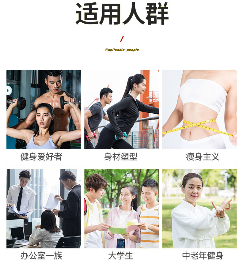 【適用人群】:健身愛好者,身材塑型、瘦身主義、辦公室一族、大學(xué)生、中老年健身。