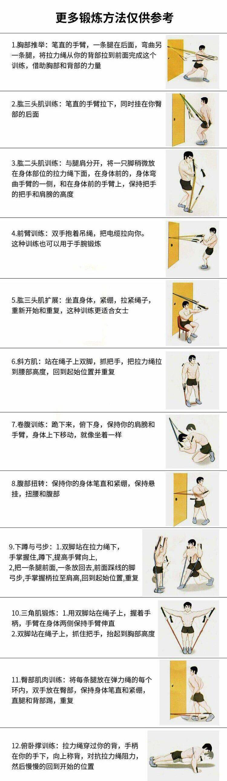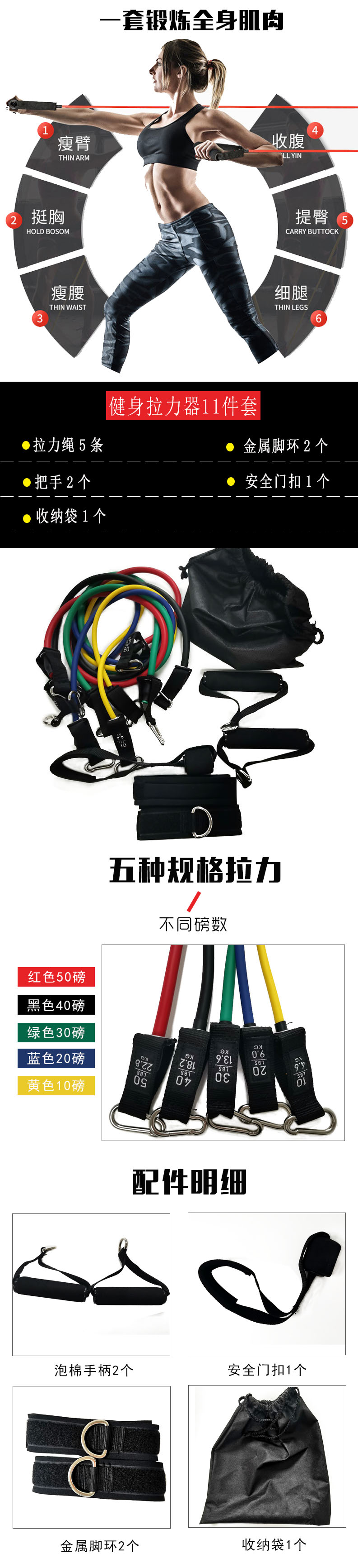 【產(chǎn)品包裝】:全套共11件,拉力繩5條,金屬腳環(huán)2個(gè),把手2個(gè),安全門扣1個(gè),收納袋1個(gè)。